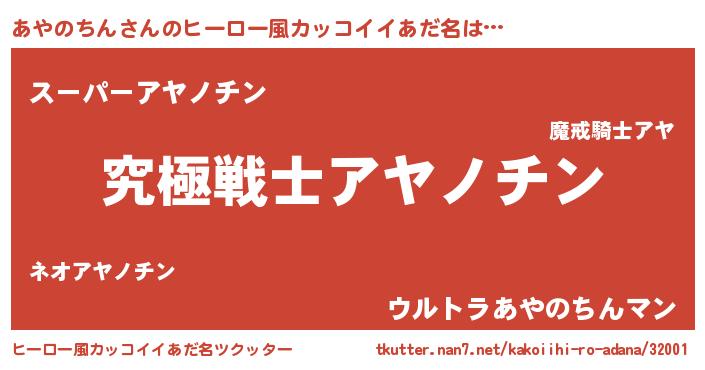 | 男性向けラノベタイトル風あだ名 | 『あやのちん~年齢イコール彼女いない歴の魔法使い~』 |