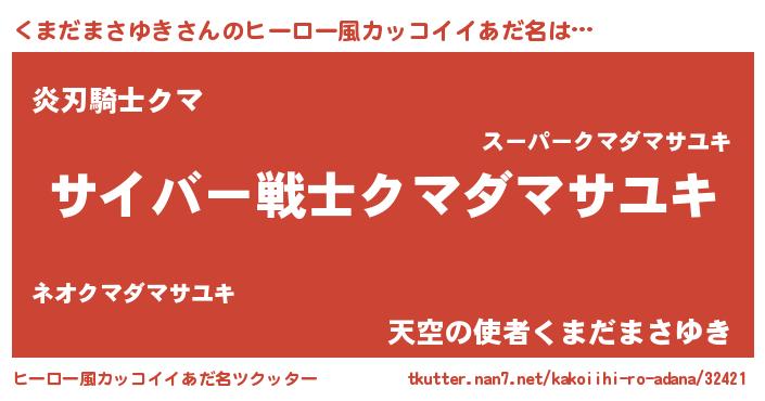 | 男性向けラノベタイトル風あだ名 | 『Re:くまだまさゆきから始める異世界生活』 |