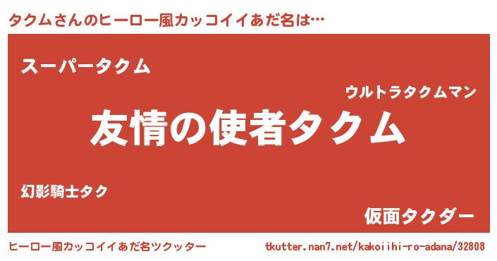 | 男性向けラノベタイトル風あだ名 | 『おまえをオタクにしてやるから、俺をタクムにしてくれ! 』 |