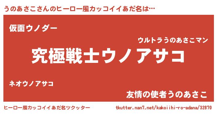 | 男性向けラノベタイトル風あだ名 | 『Re:うのあさこから始める異世界生活』 |