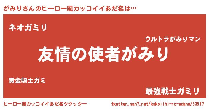 | 男性向けラノベタイトル風あだ名 | 『おまえをオタクにしてやるから、俺をがみりにしてくれ! 』 |