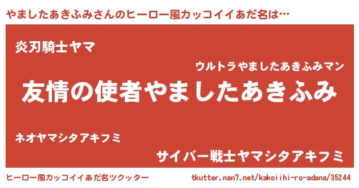 | 男性向けラノベタイトル風あだ名 | 『おまえをオタクにしてやるから、俺をやましたあきふみにしてくれ! 』 |