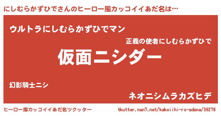 | 男性向けラノベタイトル風あだ名 | 『この素晴らしい世界ににしむらかずひでを!』 |