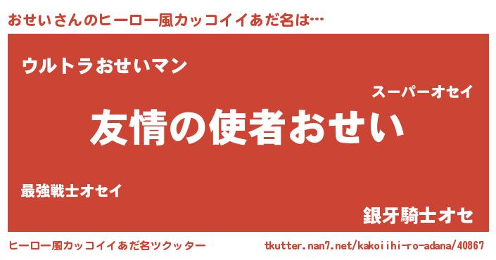| 男性向けラノベタイトル風あだ名 | 『おまえをオタクにしてやるから、俺をおせいにしてくれ! 』 |