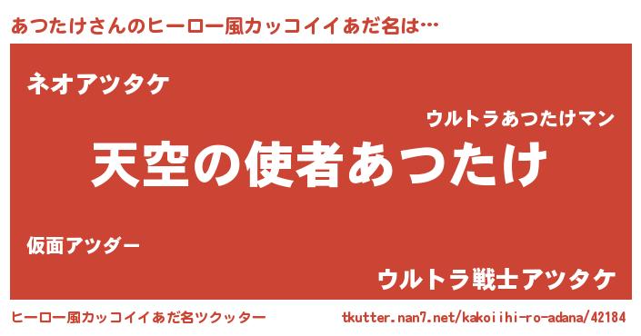 | 男性向けラノベタイトル風あだ名 | 『あつたけに滅ぼされるだけの簡単なお仕事です』 |