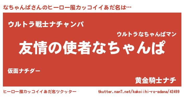 | 男性向けラノベタイトル風あだ名 | 『おまえをオタクにしてやるから、俺をなちゃんぱにしてくれ! 』 |