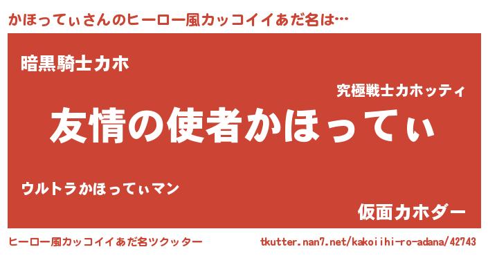 | 男性向けラノベタイトル風あだ名 | 『おまえをオタクにしてやるから、俺をかほってぃにしてくれ! 』 |
