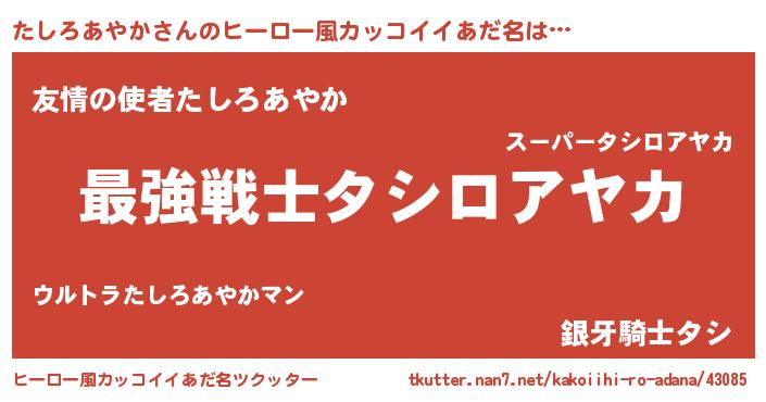 | 男性向けラノベタイトル風あだ名 | 『たしろあやか~年齢イコール彼女いない歴の魔法使い~』 |