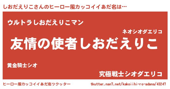 | 男性向けラノベタイトル風あだ名 | 『おまえをオタクにしてやるから、俺をしおだえりこにしてくれ! 』 |