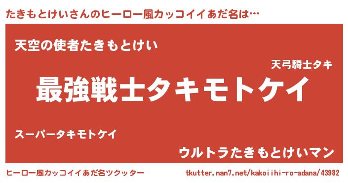 | 男性向けラノベタイトル風あだ名 | 『Re:たきもとけいから始める異世界生活』 |