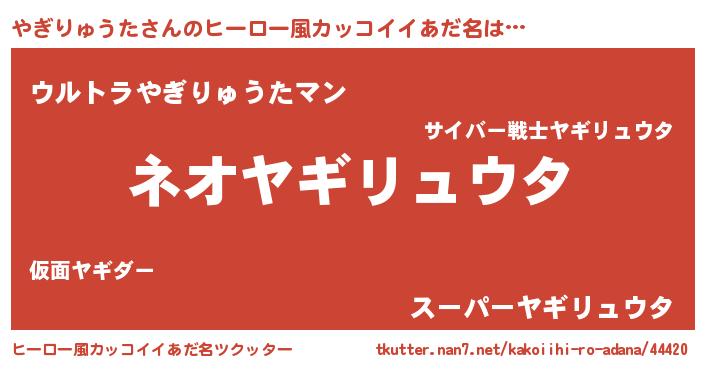 | 男性向けラノベタイトル風あだ名 | 『やぎりゅうた~年齢イコール彼女いない歴の魔法使い~』 |