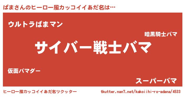 | 男性向けラノベタイトル風あだ名 | 『Re:ばまから始める異世界生活』 |
