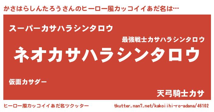 | 男性向けラノベタイトル風あだ名 | 『かさはらしんたろう~年齢イコール彼女いない歴の魔法使い~』 |