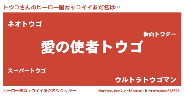 | 男性向けラノベタイトル風あだ名 | 『転生したらトウゴだった件』 |