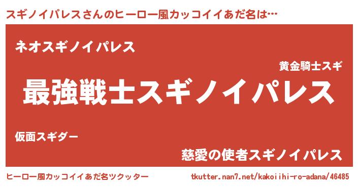 | 男性向けラノベタイトル風あだ名 | 『Re:スギノイパレスから始める異世界生活』 |