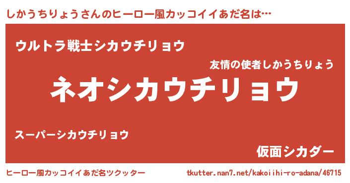 | 男性向けラノベタイトル風あだ名 | 『しかうちりょうという概念が存在しない退屈な世界 』 |
