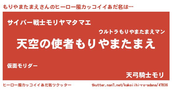 | 男性向けラノベタイトル風あだ名 | 『もりやまたまえ~年齢イコール彼女いない歴の魔法使い~』 |