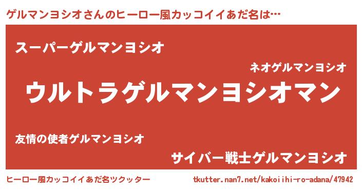 | 男性向けラノベタイトル風あだ名 | 『ゲルマンヨシオ~年齢イコール彼女いない歴の魔法使い~』 |