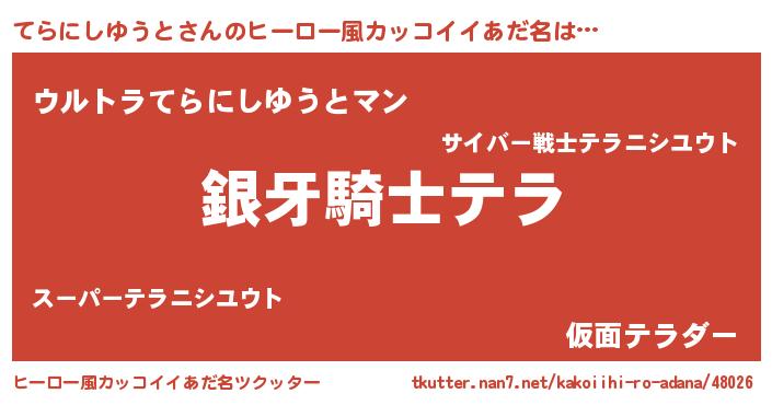 | 男性向けラノベタイトル風あだ名 | 『てらにしゆうとの嫁は女の子じゃないと思った?』 |