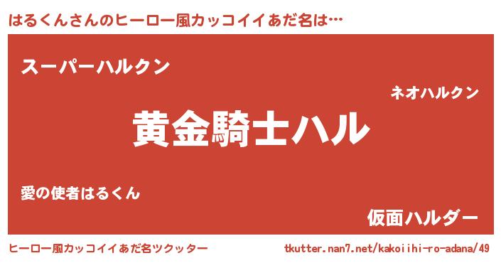 | 男性向けラノベタイトル風あだ名 | 『ハルクンスレイヤー』『はるくんの憂鬱』 |