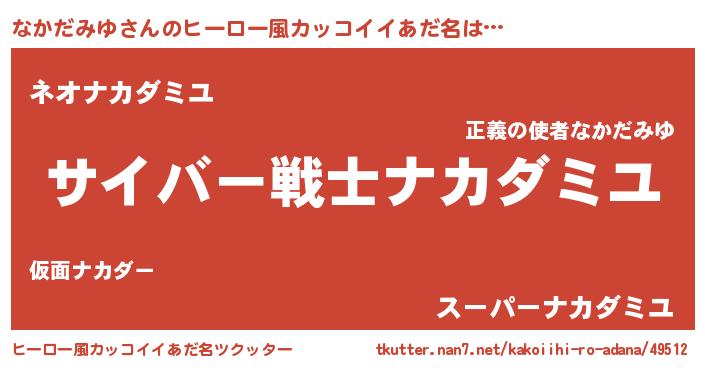 | 男性向けラノベタイトル風あだ名 | 『Re:なかだみゆから始める異世界生活』 |
