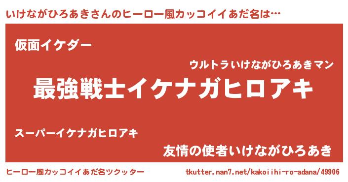 | 男性向けラノベタイトル風あだ名 | 『いけながひろあき~年齢イコール彼女いない歴の魔法使い~』 |