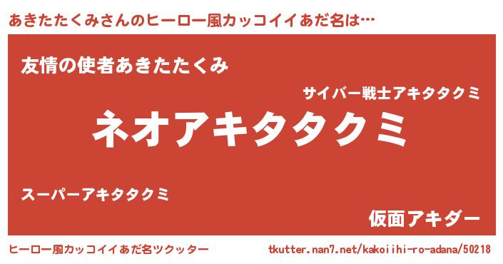| 男性向けラノベタイトル風あだ名 | 『転生したらあきたたくみだった件』 |