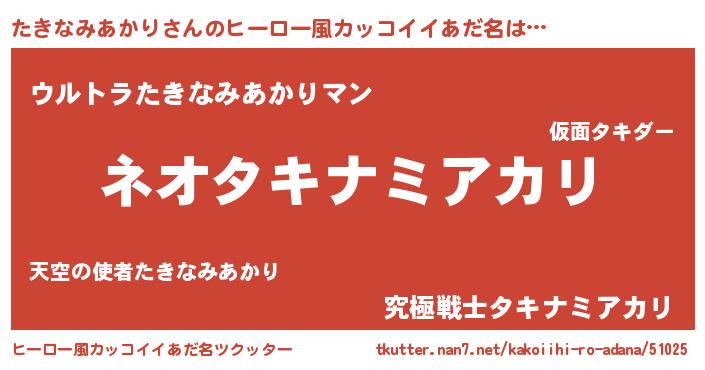 | 女子向けラノベタイトル風あだ名 | 『異世界で失敗しない100のたきなみあかり』 |