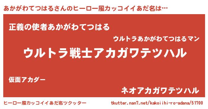 | 意味不明あだ名 | 『自称あかがわてつはる』 |