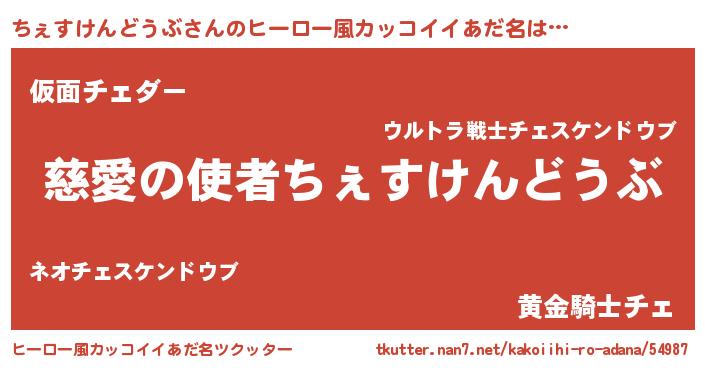 | 女子向けラノベタイトル風あだ名 | 『死神ちぇすけんどうぶの再婚』 |