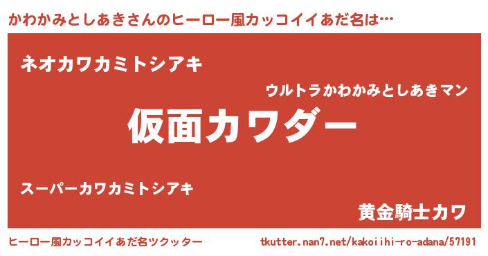 | 男性向けラノベタイトル風あだ名 | 『この素晴らしい世界にかわかみとしあきを!』 |