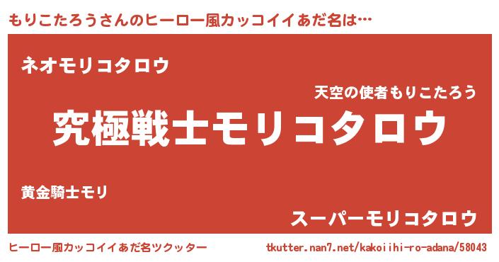 | 男性向けラノベタイトル風あだ名 | 『もりこたろう~年齢イコール彼女いない歴の魔法使い~』 |