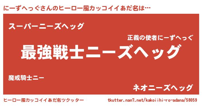 | 男性向けラノベタイトル風あだ名 | 『Re:にーずへっぐから始める異世界生活』 |