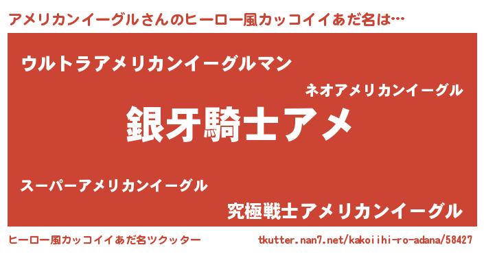 | 男性向けラノベタイトル風あだ名 | 『アメリカンイーグルの嫁は女の子じゃないと思った?』 |