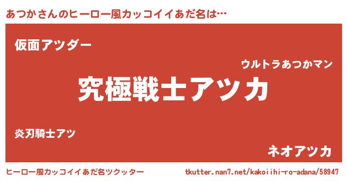 | 男性向けラノベタイトル風あだ名 | 『あつかに滅ぼされるだけの簡単なお仕事です』 |