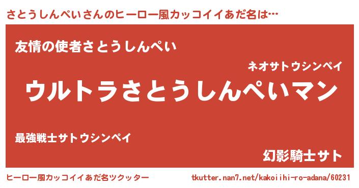 | 男性向けラノベタイトル風あだ名 | 『転生したらさとうしんぺいだった件』 |