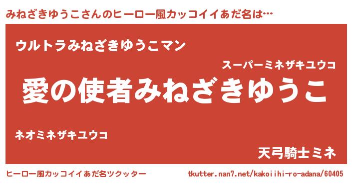 | 男性向けラノベタイトル風あだ名 | 『おまえをオタクにしてやるから、俺をみねざきゆうこにしてくれ! 』 |