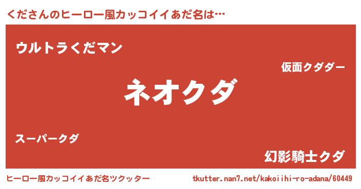 | 男性向けラノベタイトル風あだ名 | 『くだ~年齢イコール彼女いない歴の魔法使い~』 |
