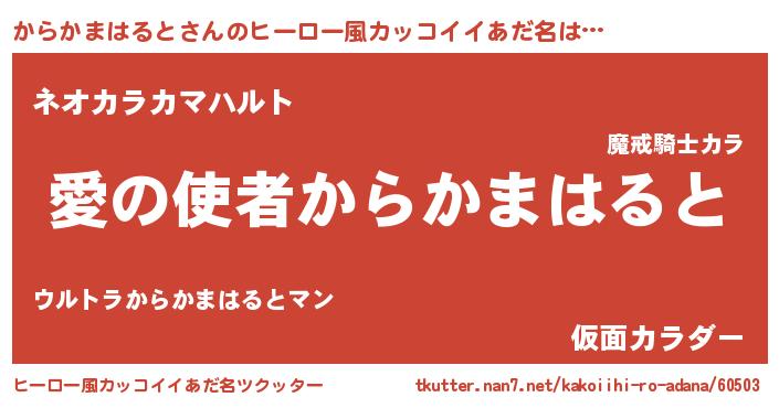 | 男性向けラノベタイトル風あだ名 | 『ノーゲーム・ノーカラカマハルト』 |