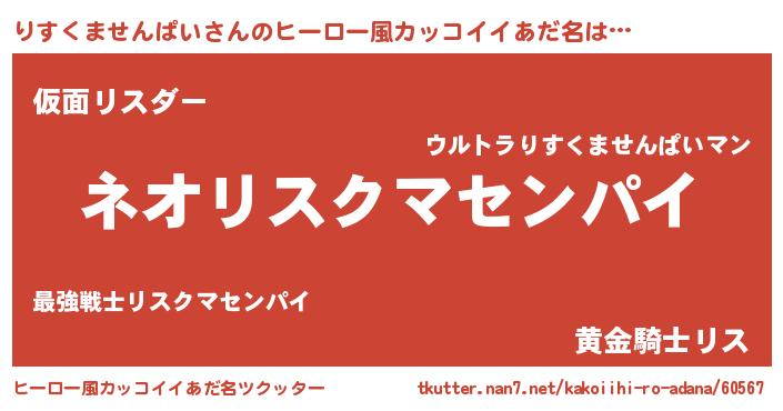 | 男性向けラノベタイトル風あだ名 | 『りすくませんぱいという概念が存在しない退屈な世界 』 |