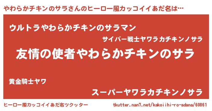 | 男性向けラノベタイトル風あだ名 | 『ヤワラカチキンノサラスレイヤー』 |