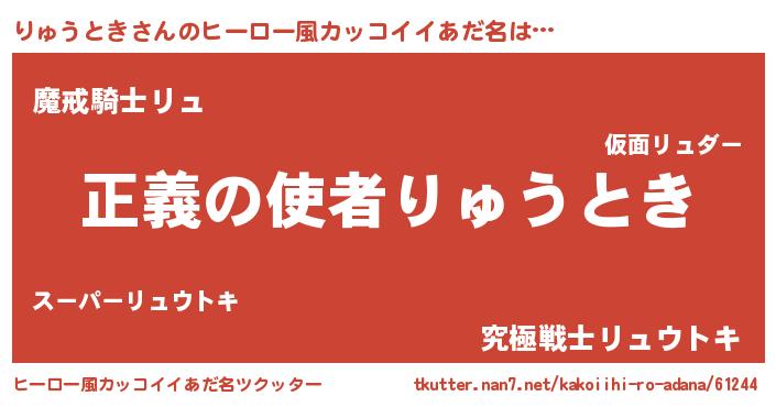 | 男性向けラノベタイトル風あだ名 | 『おまえをオタクにしてやるから、俺をりゅうときにしてくれ! 』 |