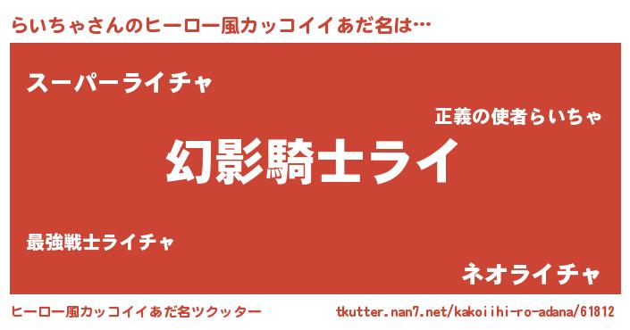| 男性向けラノベタイトル風あだ名 | 『らいちゃの嫁は女の子じゃないと思った?』 |