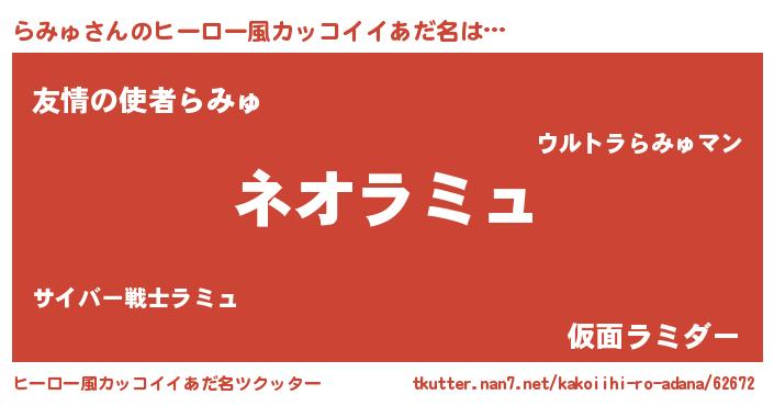 | 女子向けラノベタイトル風あだ名 | 『らみゅの玉の輿計画!』 |