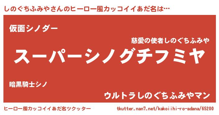 | 男性向けラノベタイトル風あだ名 | 『しのぐちふみや~年齢イコール彼女いない歴の魔法使い~』 |