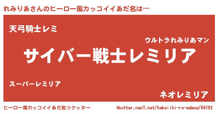 | 男性向けラノベタイトル風あだ名 | 『Re:れみりあから始める異世界生活』 |