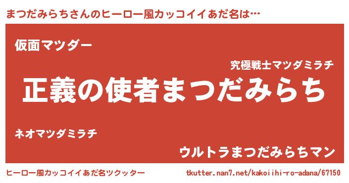 | 男性向けラノベタイトル風あだ名 | 『おまえをオタクにしてやるから、俺をまつだみらちにしてくれ! 』 |