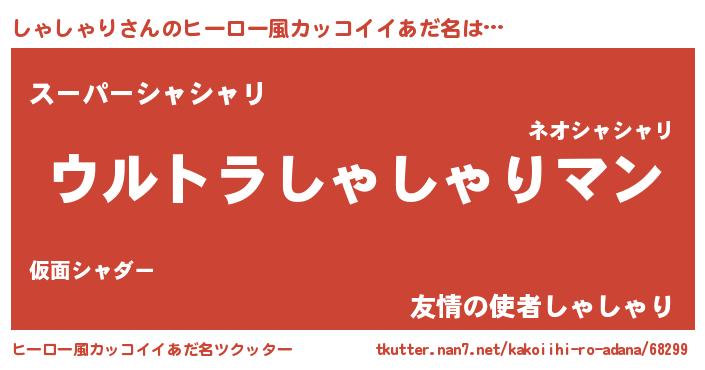 | 男性向けラノベタイトル風あだ名 | 『しゃしゃり~年齢イコール彼女いない歴の魔法使い~』 |
