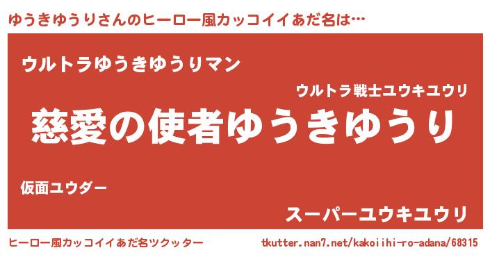 | 男性向けラノベタイトル風あだ名 | 『ゆうきゆうり~年齢イコール彼女いない歴の魔法使い~』 |
