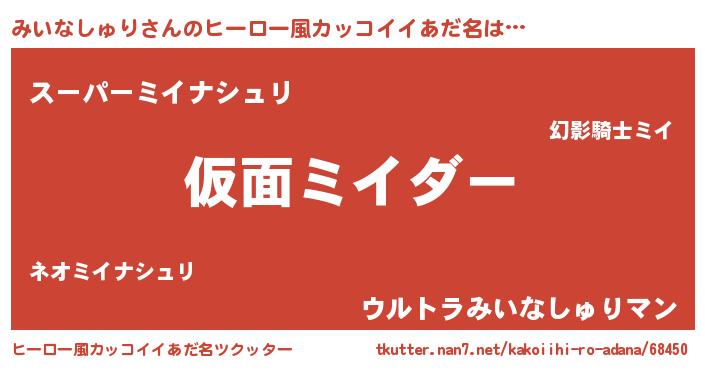 | 女子向けラノベタイトル風あだ名 | 『みいなしゅりが死なない童話 林檎のみいなしゅりの診療簿』 |
